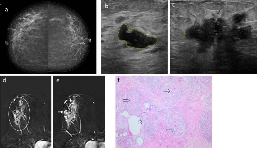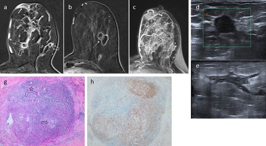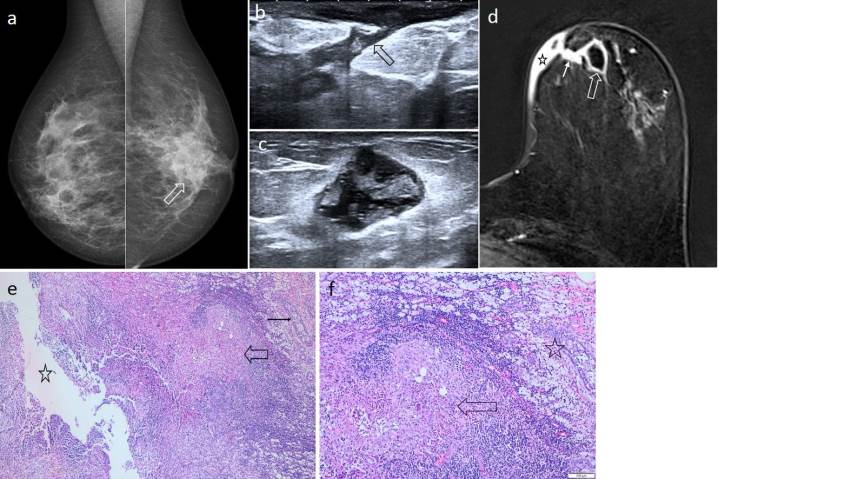 Idiopathic granulomatous mastitis is a rare, chronic, benign inflammatory disease of the breast that tends to be unilateral. It differs from other granulomatous breast diseases in that it lacks a definitive underlying etiology. However, lactation, hormonal changes, trauma, infections, and autoimmunity have been implicated in the etiology. Idiopathic granulomatous mastitis can mimic a wide spectrum of benign and malignant conditions, including bacterial mastitis, sarcoidosis, tuberculosis, vasculitic diseases, diabetic mastopathy, and inflammatory breast cancer; therefore, accurate diagnosis requires clinical, radiological, and pathological correlation. The diagnosis of idiopathic granulomatous mastitis is more often a diagnosis of exclusion. A woman of reproductive age, who has undergone lactation, and presents with a palpable breast mass and concomitant inflammatory findings (such as pain, fever, erythema) is the most common presentation. Radiological findings can be evaluated together with histopathological findings to arrive at a correct diagnosis. The radiological findings of idiopathic granulomatous mastitis can be nonspecific. However, radiological findings are quite helpful in establishing a preliminary diagnosis, determining the extent of the disease, and distinguishing it from malignant lesions. On mammography, the most common findings are an irregularly bordered mass or an asymmetrically increased opacity; on ultrasonography, hypoechoic tubular structures and an accompanying irregularly bordered hypoechoic mass; and on magnetic resonance imaging, the most common findings are segmentally distributed non-mass-like enhancing areas, a heterogeneous enhancing mass, and lesions representing a well-circumscribed, rim-like enhancing abscess. If idiopathic granulomatous mastitis is suspected clinically and radiologically, histopathological confirmation can be used to support the preliminary diagnosis. Currently, core needle biopsy is often preferred due to its less invasive nature and high diagnostic yield compared to excision. Histopathologically, it is seen as an inflammation involving the breast lobules and the fatty tissue surrounding the lobules, with sterile granulomas accompanied by Langerhans-type giant cells and epithelioid histiocytes.
